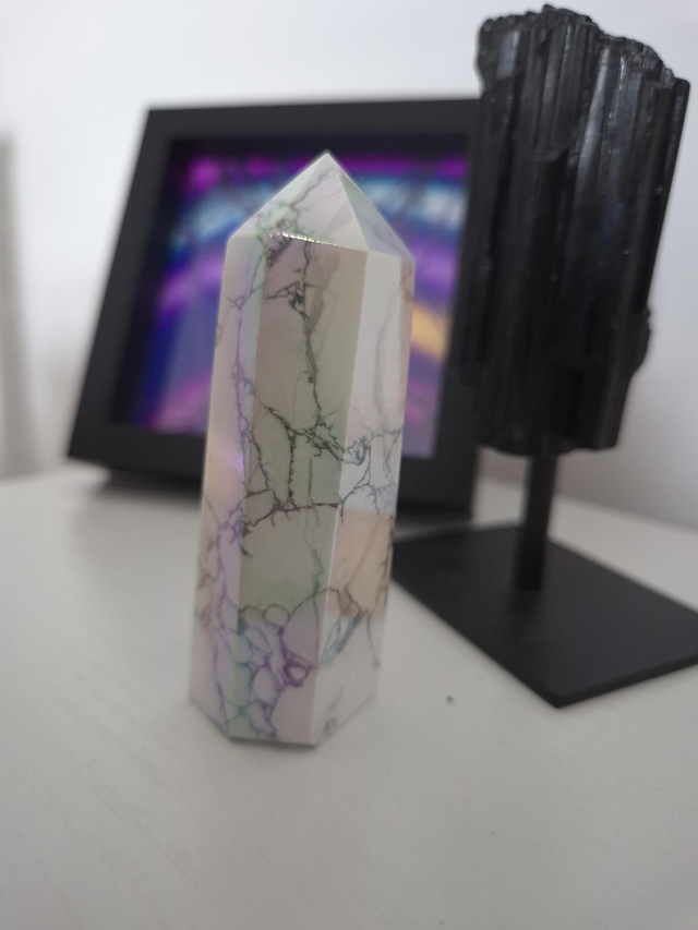 White Howlite carries gentle, calming energy, supporting relaxation, inner peace, and a restful night’s sleep. Enhanced with an aura finish for a touch of extra magic