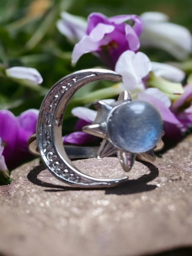 This beautiful Labradorite Sun & Moon Ring is silver plated and can be adjusted slightly to increase the size.